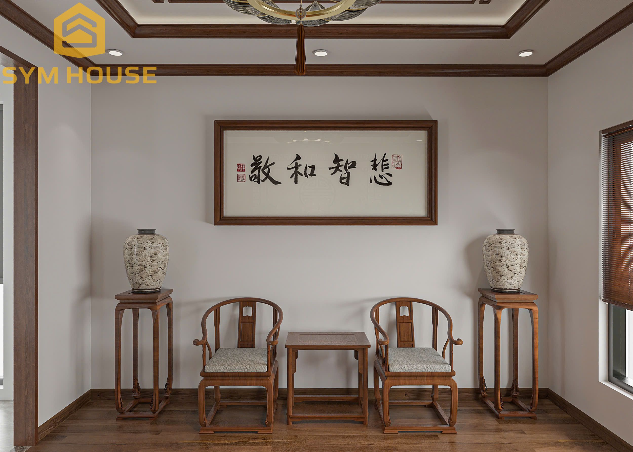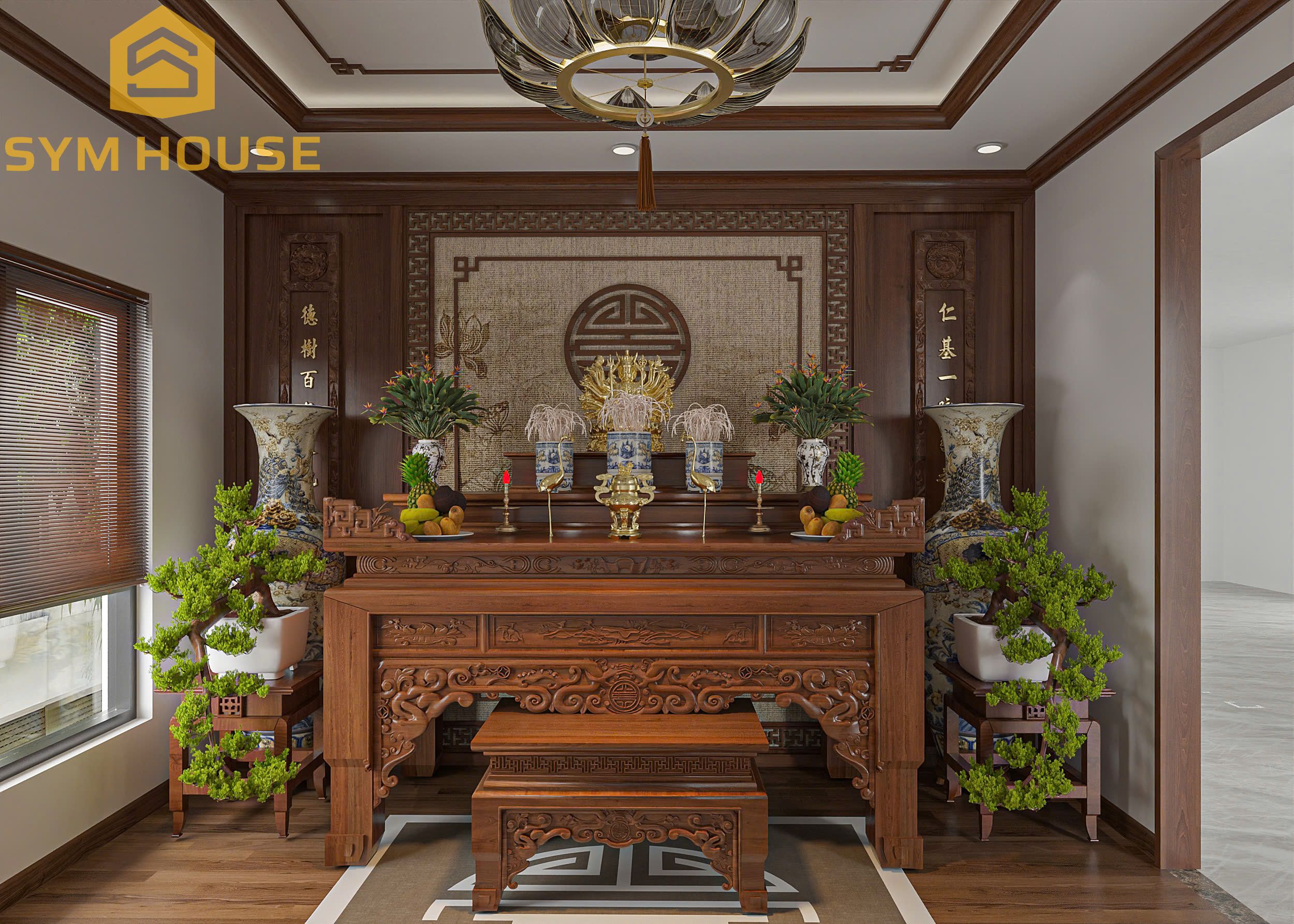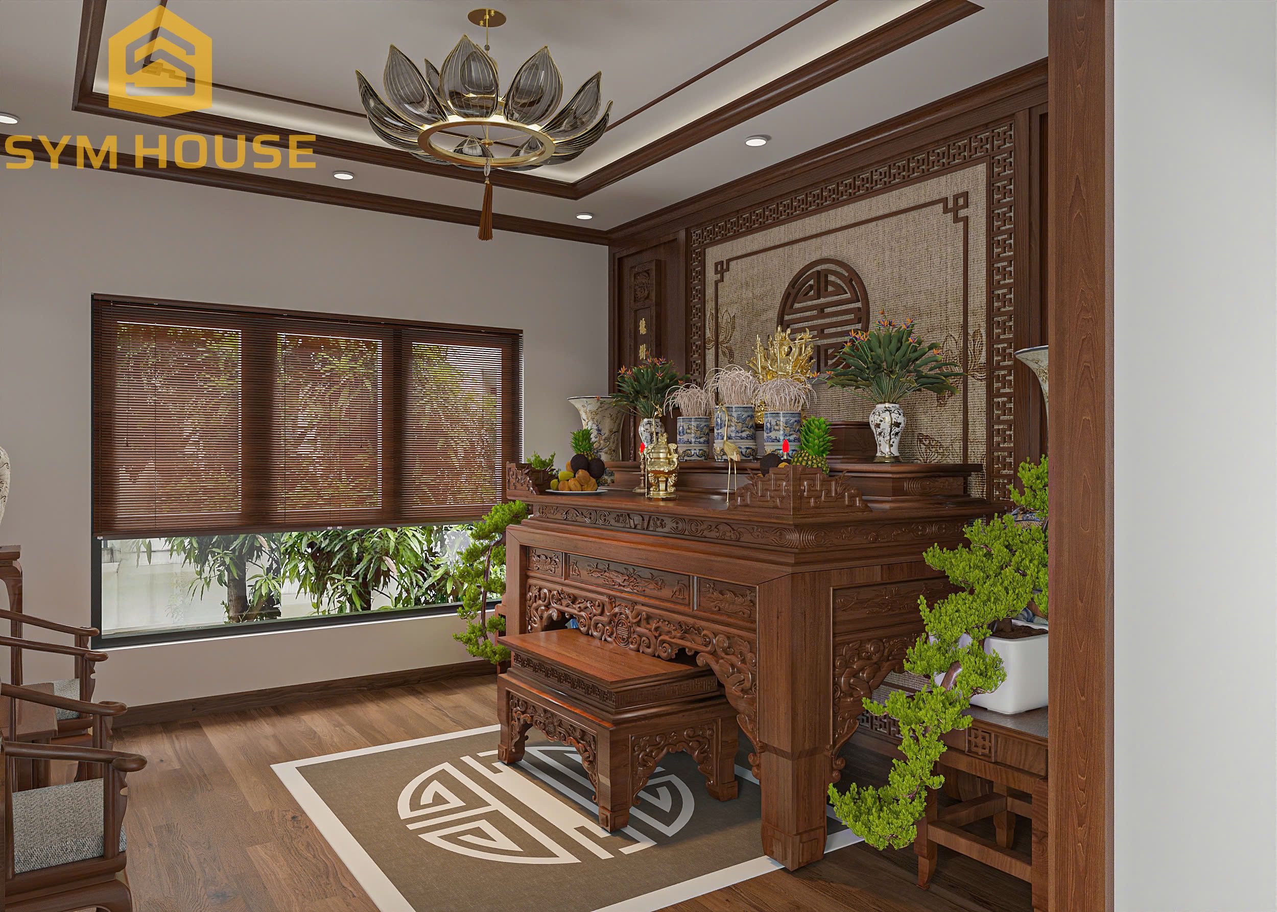 Không gian phòng thờ được thiết kế đậm chất Á Đông, thể hiện giá trị văn hóa và tinh thần truyền thống của gia đình Việt. Toàn bộ nội thất sử dụng gỗ tự nhiên chạm khắc tinh xảo, mang lại cảm giác linh thiêng, trang trọng. Các chi tiết đèn trần, bình gốm và cây bonsai được sắp đặt hài hòa, giúp không gian thêm tĩnh tại và ấm cúng