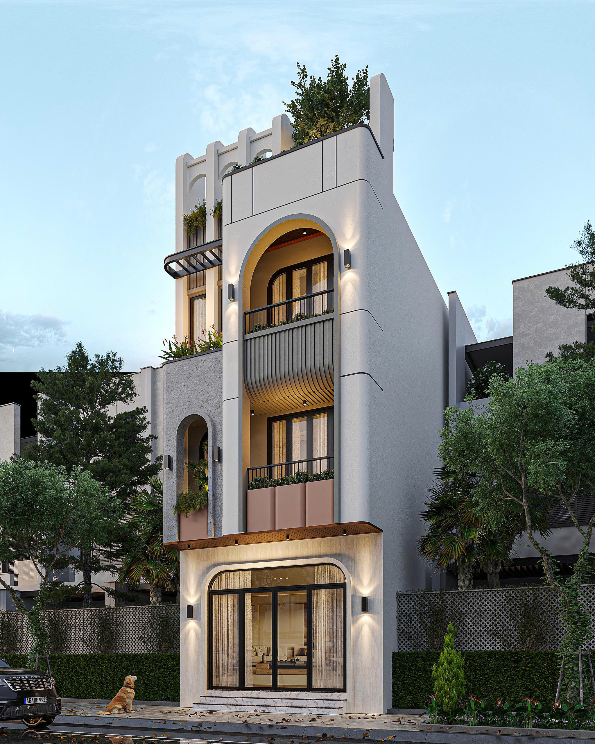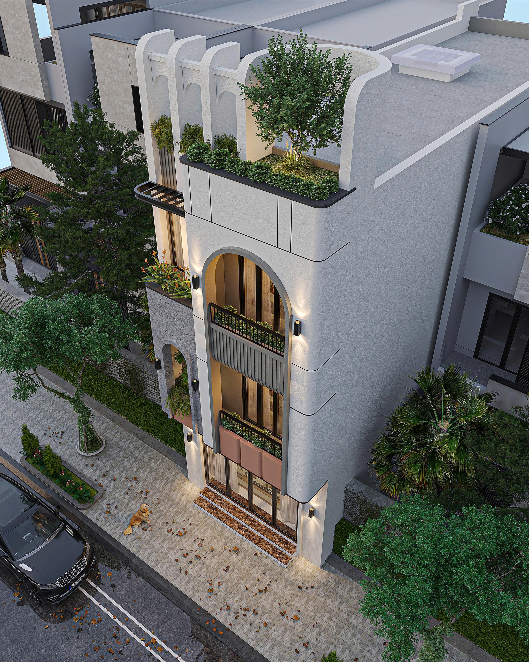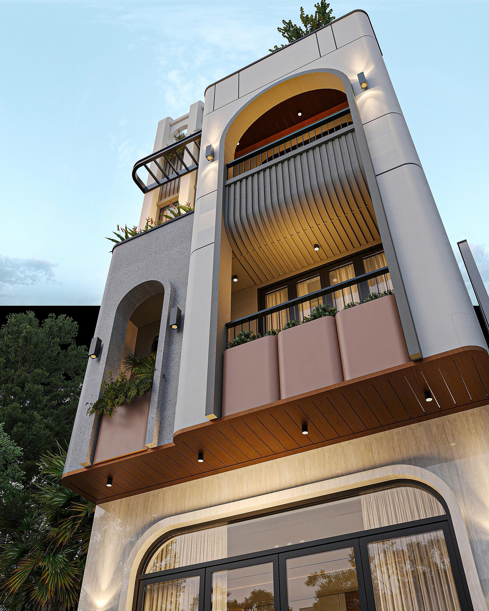 Mặt tiền công trình sử dụng hệ vòm cong kết hợp ban công bo tròn nhằm tạo chuyển động mềm mại cho tổng thể kiến trúc nhà phố hiện đại 300m2.